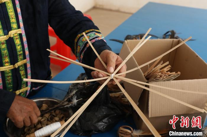 今年62歲的班繼聯(lián)從小就跟隨長輩學(xué)習(xí)香火球的制作技藝,至今已有50余年?!熬幙椣慊鹎颍诓牧系倪x擇上,必須得選用新竹和雞的飛羽,羽毛以長為好,顏色鮮艷為宜。編織完成后,得點(diǎn)香熏制24小時,以延長它的存放時間,熏制后呈現(xiàn)古銅色,拍打旋轉(zhuǎn)起來非常美觀?!?/p>