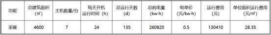 測(cè)評(píng)結(jié)果顯示,黑龍江大慶市采暖周期為四個(gè)月,地暖機(jī)24h不間斷運(yùn)行天數(shù)達(dá)135天,單位面積日均耗電量為0.34kWh/(㎡·d),總耗電量260820kw·h,單位面積運(yùn)行費(fèi)用28.35元/㎡。
