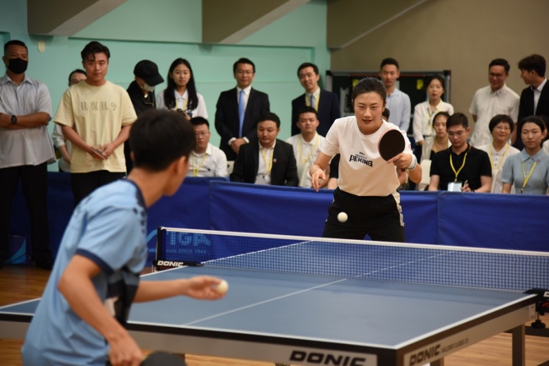 7月17日下午,在政大體育館,大陸學生團團長、奧運冠軍丁寧與政大乒乓球校隊選手切磋球技。新華社記者 王承昊 攝
