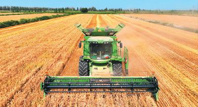 近日,在新疆維吾爾自治區(qū)巴音郭楞蒙古自治州庫爾勒市托布力其鄉(xiāng)一處麥田,大型聯(lián)合收割機正在收割小麥。確·胡熱攝(人民視覺)