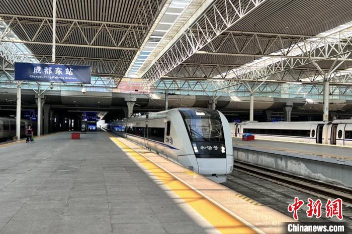 試驗(yàn)動(dòng)車組正從成都東站駛出。成蘭鐵路公司供圖