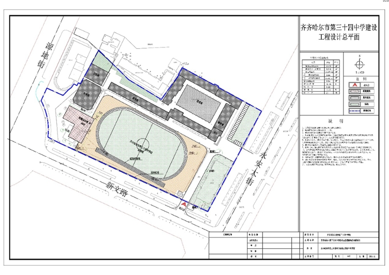 齊齊哈爾市政府網(wǎng)站2021年12月發(fā)布的《齊齊哈爾市第三十四中學(xué)建設(shè)工程設(shè)計(jì)總平面批前公示》,圖例顯示藍(lán)色為用地紅線。