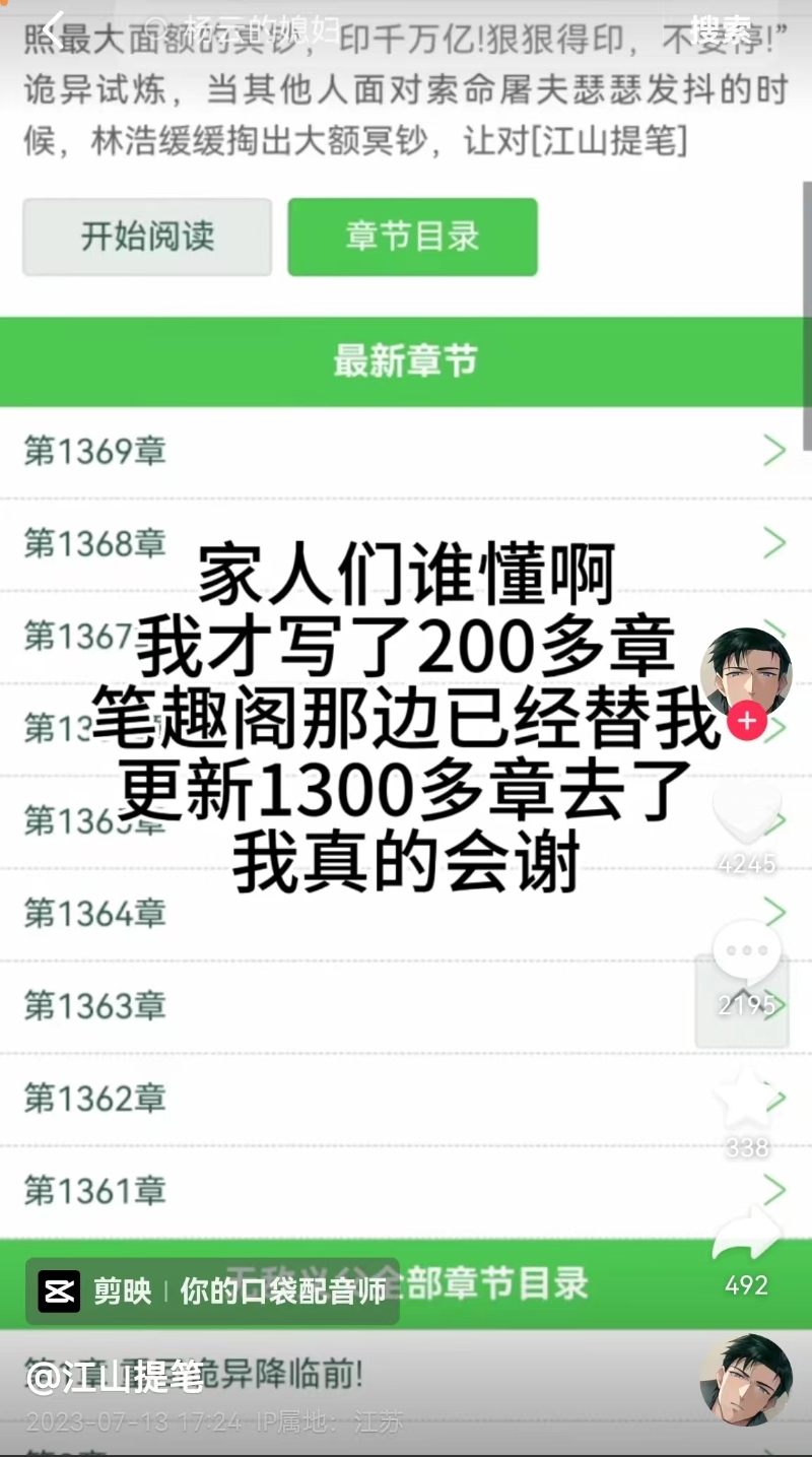 近日,網(wǎng)絡(luò)作家“江山提筆”公開(kāi)表示自己的連載小說(shuō)《詭異末日:開(kāi)局狂印千萬(wàn)億冥鈔》更新到245章,卻發(fā)現(xiàn)被盜版網(wǎng)站搬運(yùn)內(nèi)容后已經(jīng)將小說(shuō)更新到了1000多章,并吐槽“盜版網(wǎng)站可能掙得比自己還多”。
