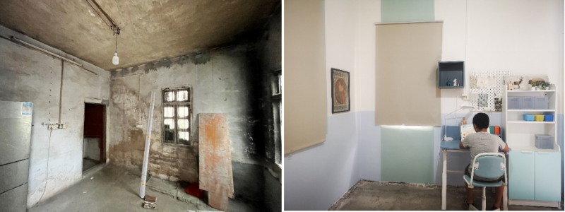 馮境倫小朋友的家也是被選中免費(fèi)煥新屋的10戶家庭中一個(gè),你很難想象,小境倫的房間前身竟是一間廚房!這間“廚房”從來沒有涂刷過,墻體殘舊、墻面裸露,甚至沒有像樣的門窗。小境倫長大上學(xué)了,單身的父親不得不為孩子艱難“騰”出來一個(gè)獨(dú)立的生活空間,希望孩子能夠安心學(xué)習(xí)。但是改造房間成了這個(gè)困難家庭的大問題。多樂士的公益煥新無疑是雪中送炭,為境倫小朋友帶來了充滿色彩的希望。