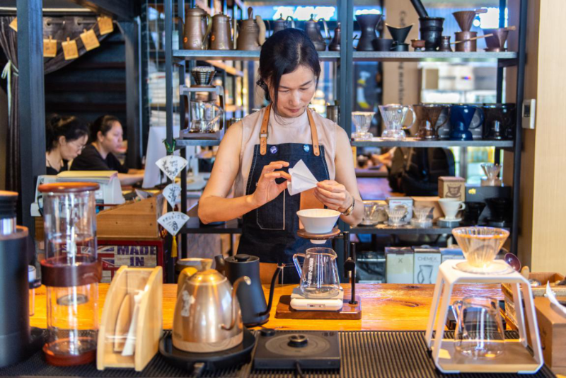 7月1日,在湖南高橋大市場(chǎng)的“咖啡一條街”,玖秀咖啡負(fù)責(zé)人肖雍琪在沖泡咖啡。新華社記者 陳思汗 攝