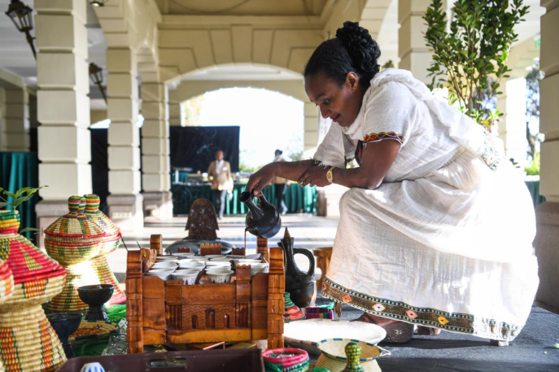 2月13日,在埃塞俄比亞首都亞的斯亞貝巴,一名婦女在沖泡當(dāng)?shù)貍鹘y(tǒng)咖啡。新華社發(fā)(邁克爾·特韋爾德攝)