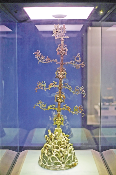 其中出土的東漢綠釉紅陶扶桑,俗稱“搖錢樹”?!皳u錢樹”是我國西南地區(qū)的一種特殊陪葬品?!皞髡f搖動樹干,就會源源不斷地掉下錢幣,在老百姓心中,它就是財富的象征。”秦佳穎說。