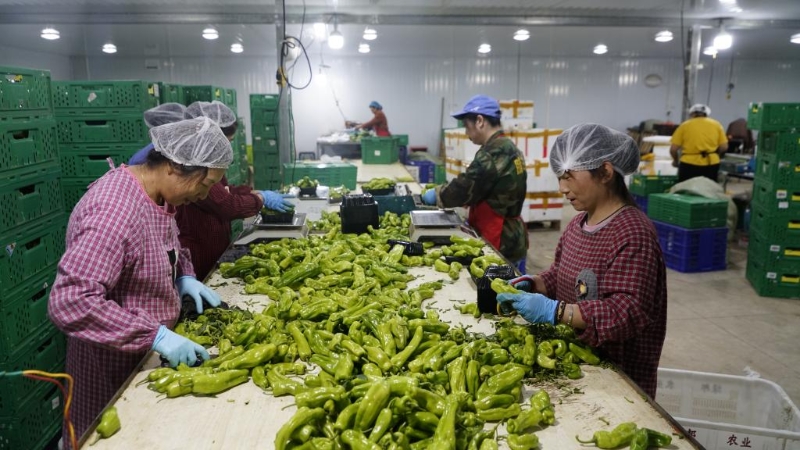 時(shí)值正午,屋外烈日當(dāng)空,屋內(nèi)一片涼爽。在恒溫26攝氏度的分揀廠房中,工人們正修剪、挑選、打包,一盒盒包裝精致的青椒、土豆等被送進(jìn)物流箱,等待發(fā)貨。