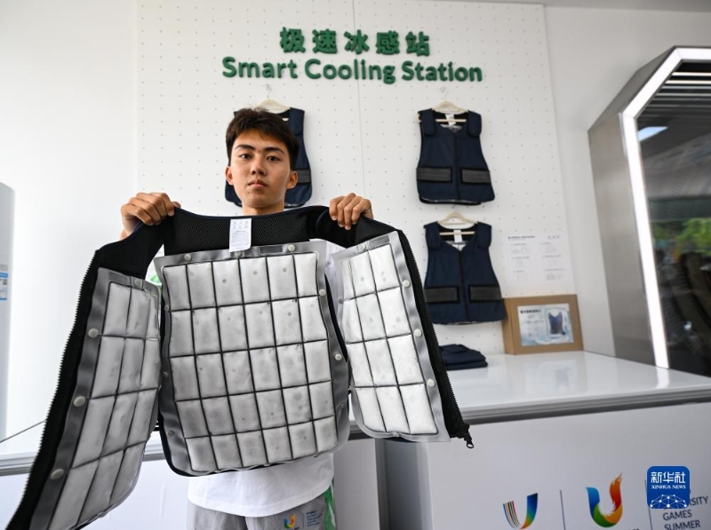 7月15日,在大運(yùn)村科技服務(wù)工作站,工作人員在展示降溫冰背心。