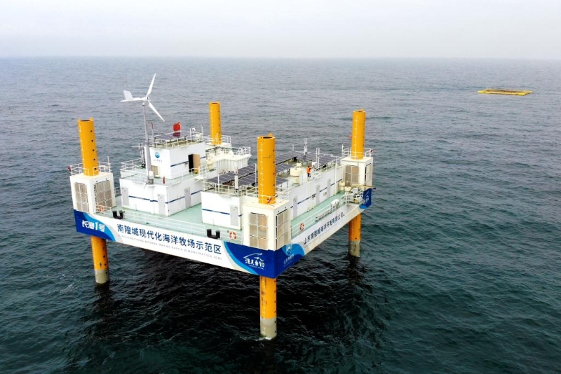山東長島綜合試驗區(qū)南隍城國家級海洋牧場示范區(qū)海上平臺(無人機照片)。新華社記者王凱 攝