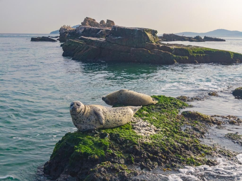 在長島海域,斑海豹在礁石上休憩(無人機照片)。新華社發(fā)(張維康 攝)