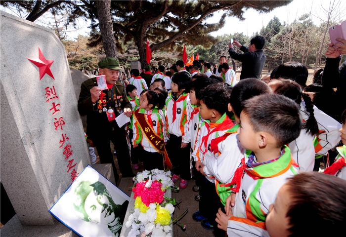 在沈陽抗美援朝烈士陵園,志愿軍老戰(zhàn)士向?qū)W生們講述邱少云的英雄事跡。張文魁 攝