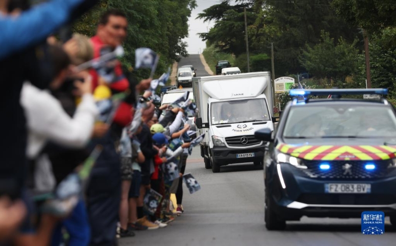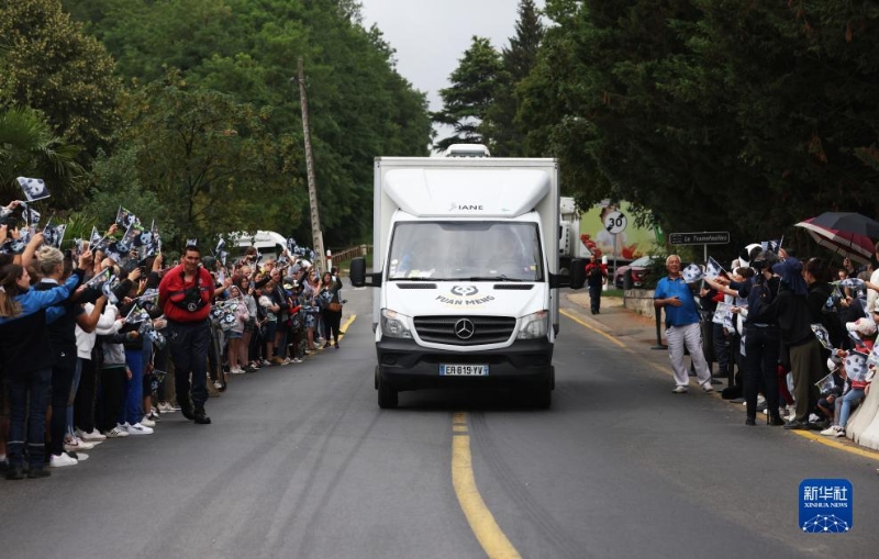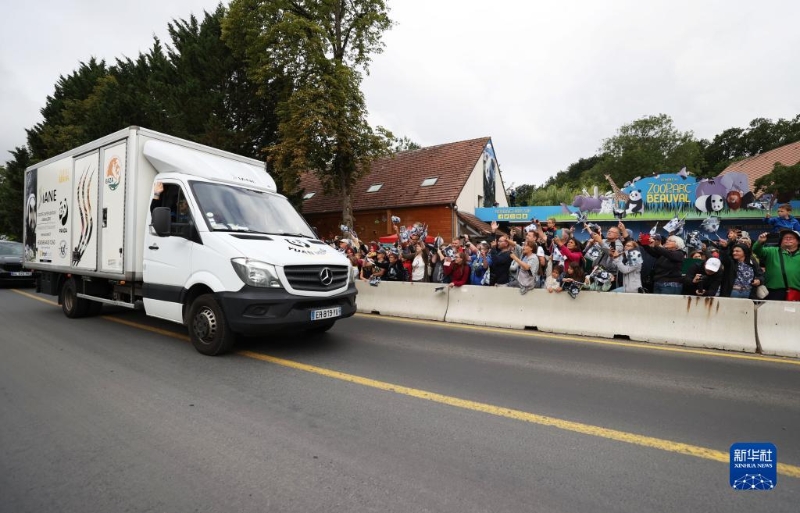 7月25日,在法國圣艾尼昂市博瓦勒野生動(dòng)物園外,人們送別搭載熊貓“圓夢”的車離開。
