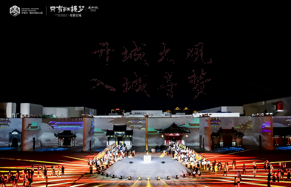 隨著音樂(lè)響起,激光束自舞臺(tái)射向天空,猶如巨型光筆在天空中書寫。光筆在空中觸發(fā)了無(wú)人機(jī)群動(dòng)作,展開(kāi)無(wú)人機(jī)表演。一本巨大的《紅樓夢(mèng)》書籍打開(kāi),文字像星火從空中墜入幻城,緊接著,由無(wú)人機(jī)組成的讀者符號(hào)——紅色官帽椅,從幻城中冉冉升起。椅子化做只有紅樓夢(mèng)·戲劇幻城logo,并點(diǎn)燃機(jī)身攜帶的冷煙花,在空中飄舞,最終化成邀請(qǐng)文字“開(kāi)城大觀,入城尋夢(mèng)”。在歡呼聲中,游客們紛紛入城,真正開(kāi)啟了屬于自己的中國(guó)文化探尋之旅。