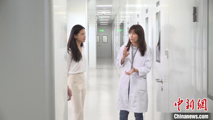 6月21日,凌楷鈞(左一)在穎奕國際醫(yī)療中心生物實驗室里與醫(yī)療專家交談。 中新社記者 林士杰 攝
