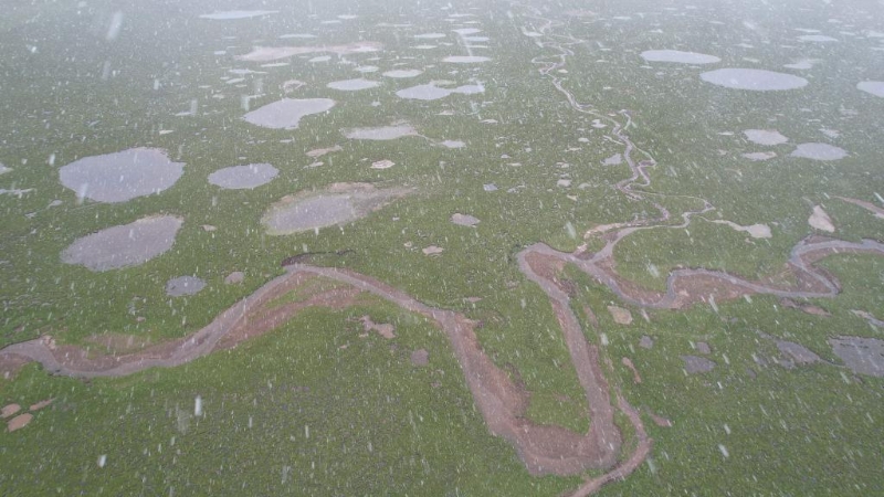 記者在距離當(dāng)曲源頭不到10公里處升起無(wú)人機(jī)看到,沼澤濕地中,大大小小的沼澤湖泊星羅棋布。