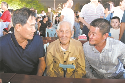 圖③:東山保衛(wèi)戰(zhàn)參戰(zhàn)老兵林清海(中)在親屬陪同下觀看表演。