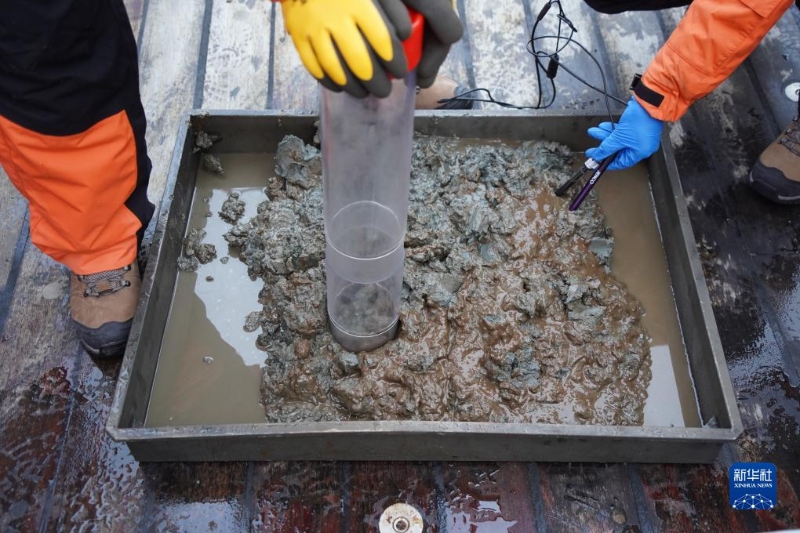 7月26日,中國第13次北冰洋科學(xué)考察隊(duì)隊(duì)員在采集箱式沉積采樣獲取的海洋底質(zhì)樣品。新華社記者 魏弘毅 攝