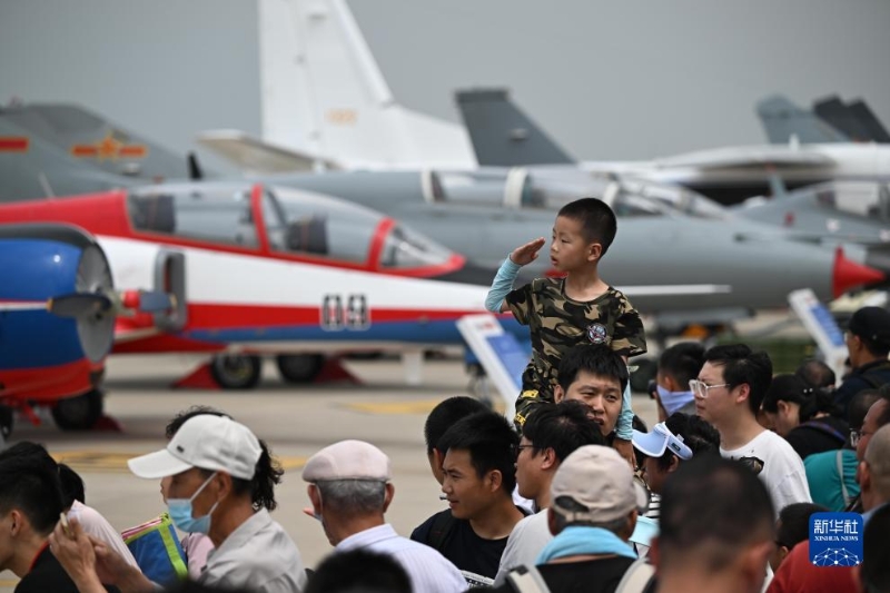 7月27日,在空軍航空開放活動·長春航空展首個公眾日,一名男孩向人民空軍敬禮。