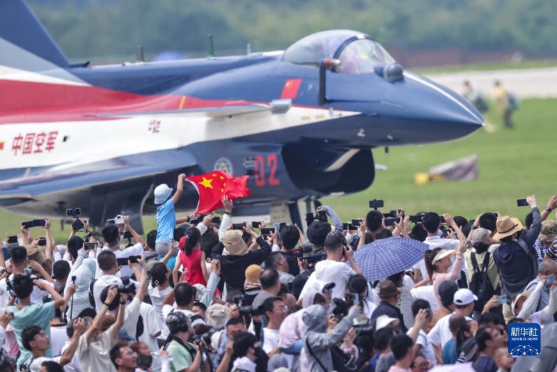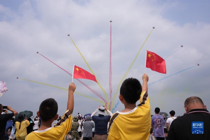 7月27日,在空軍航空開放活動·長春航空展首個公眾日,觀眾高舉國旗與飛行員互動。