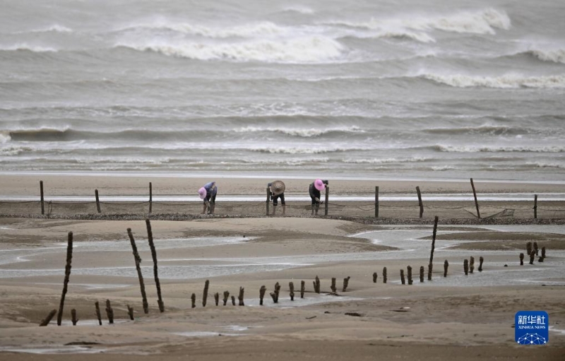 在福州市長樂區(qū),漁民在海灘上抓緊收網(wǎng)上岸(7月27日攝)。