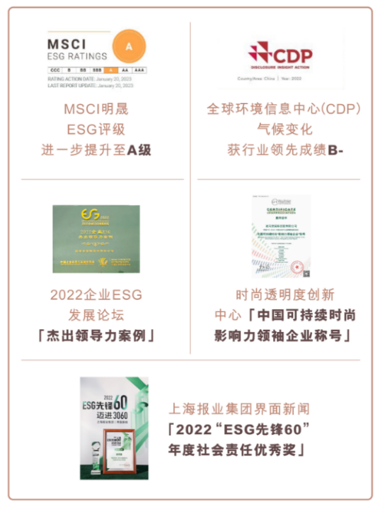 作為中國領(lǐng)先羽絨服企業(yè),波司登ESG評級表現(xiàn)持續(xù)穩(wěn)步提升。今年,波司登的MSCI明晟ESG評級榮獲“A”級,并獲得CDP氣候變化“B-”評級,為目前(截至2023年7月)中國紡織服裝企業(yè)所獲得的最優(yōu)評級。此外,在22/23財年,波司登還榮膺上海報業(yè)集團界面新聞頒發(fā)的「2022“ESG先鋒60”年度社會責任優(yōu)秀獎」與時尚透明度創(chuàng)新中心所頒發(fā)的「中國可持續(xù)時尚影響力領(lǐng)袖企業(yè)稱號」。