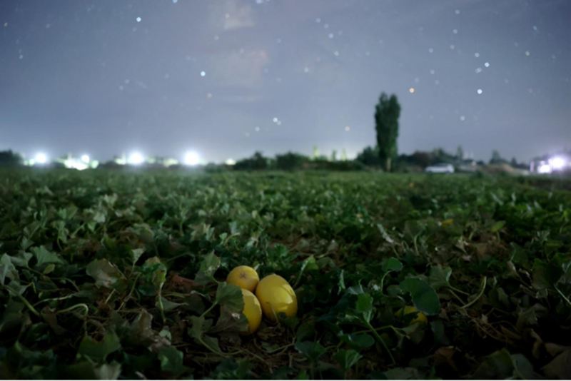 2023年7月21日,在新疆哈密伊州區(qū)南湖鄉(xiāng)拍攝的星光之下的成熟哈密瓜。(王俊峰攝)