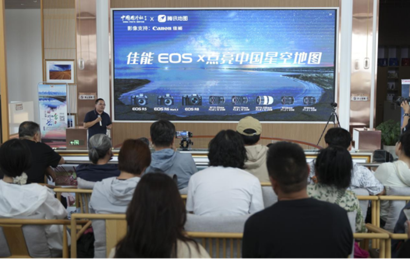 2023年7月17日,在新疆哈密巴里坤高家湖,中國圖片集團(tuán)王俊峰介紹“點(diǎn)亮中國星空地圖”IP項(xiàng)目。(解立春 攝)