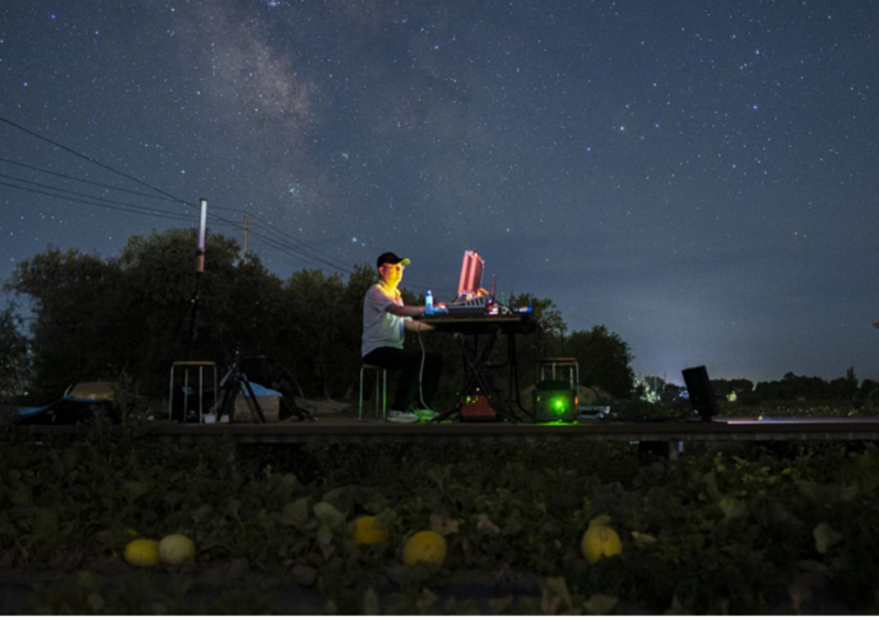 2023年7月21日,直播團(tuán)隊(duì)在新疆哈密南湖鄉(xiāng)瓜田進(jìn)行星空專題直播。(孟凡程攝)