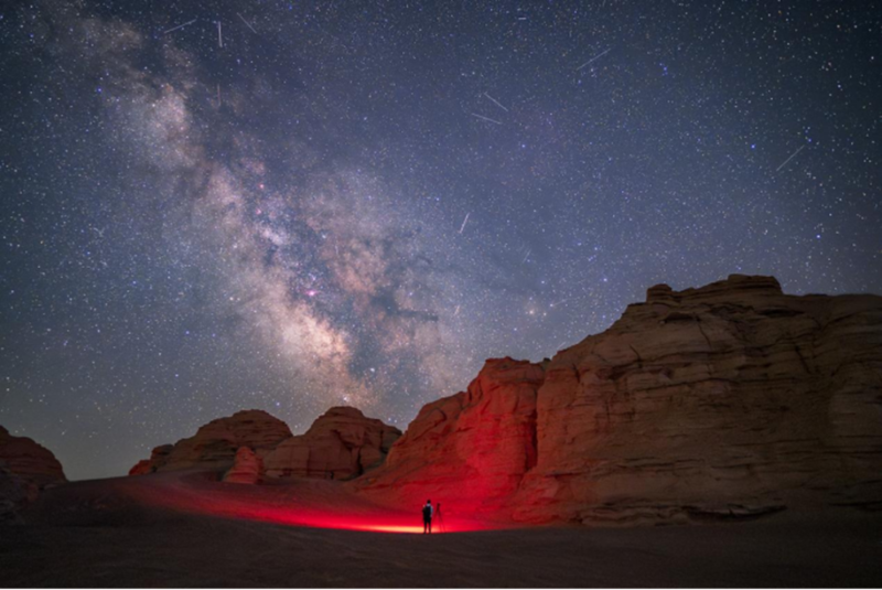 2023年7月20日,星空攝影愛好者在新疆哈密魔鬼城記錄夏日星空。(戴建峰攝)