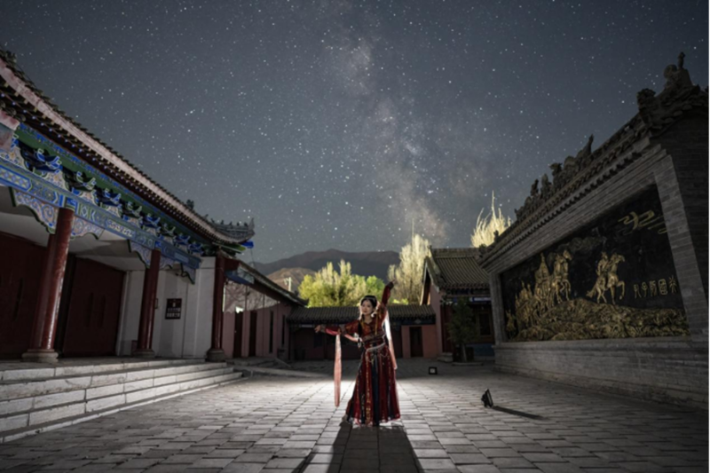 2023年7月17日,在新疆哈密巴里坤古城,一名漢服愛好者和星空“合影”。(周博攝)