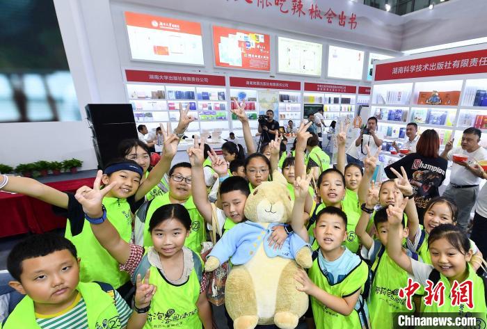 在湖南科學(xué)技術(shù)出版社展位前,小朋友“組團(tuán)”打卡比得兔。李丹攝