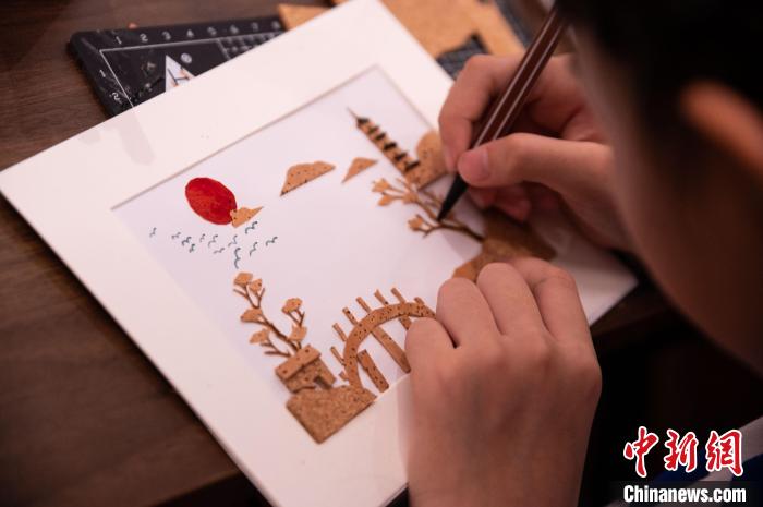 “叢山數(shù)百里,盡在一框中”,當(dāng)福州軟木畫技藝第五代非遺傳承人郭麗將精美的軟木畫作品展示眼前時(shí),孩子們不禁發(fā)出感嘆,“居然能在小小的畫框里雕刻出山巒起伏的模樣,太神奇了!”“山上的樹木花草居然也能雕刻出來(lái),真是精巧!”