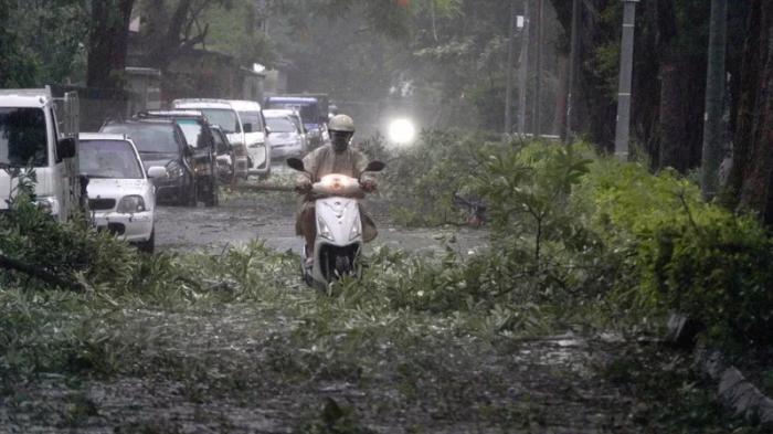 臺(tái)風(fēng)“杜蘇芮”來襲,高雄多區(qū)路樹倒塌,騎士風(fēng)雨中冒險(xiǎn)騎車。圖片來源:臺(tái)灣聯(lián)合新聞網(wǎng) 劉學(xué)圣 攝