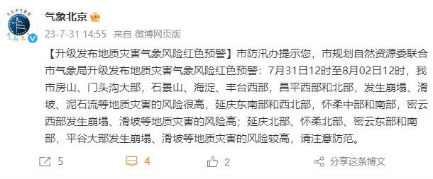 中新網(wǎng)7月31日電 據(jù)北京市氣象局官方微博消息,北京市規(guī)劃自然資源委聯(lián)合市氣象局升級發(fā)布地質(zhì)災(zāi)害氣象風(fēng)險紅色預(yù)警:7月31日12時至8月02日12時,北京市房山、門頭溝大部,石景山、海淀、豐臺西部,昌平西部和北部,發(fā)生崩塌、滑坡、泥石流等地質(zhì)災(zāi)害的風(fēng)險很高,延慶東南部和西北部,懷柔中部和南部,密云西部發(fā)生崩塌、滑坡等地質(zhì)災(zāi)害的風(fēng)險高;延慶北部、懷柔北部、密云東部和南部,平谷大部發(fā)生崩塌、滑坡等地質(zhì)災(zāi)害的風(fēng)險較高,請注意防范。