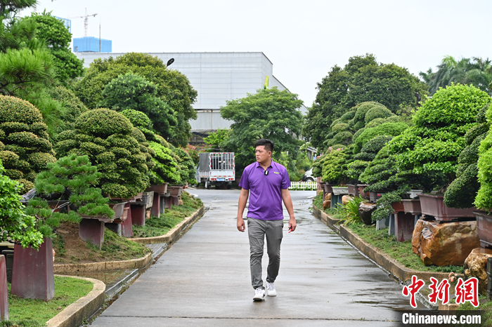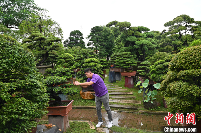 圖為7月18日,廣東佛山,王俞又在嘉盛園藝總場(chǎng)查看盆景長勢(shì)。 中新社記者 陳楚紅 攝