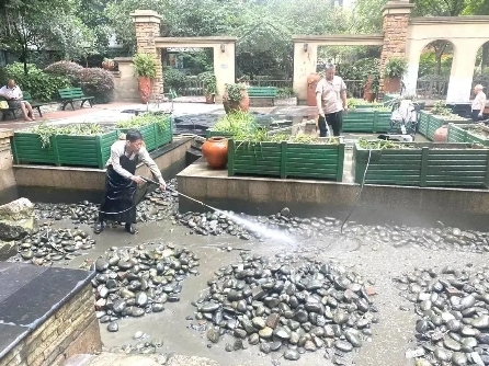 凱麗香江內(nèi)有個(gè)觀景水池,因前期開(kāi)發(fā)設(shè)計(jì)的原因,水池水位較低,且四周沒(méi)有護(hù)欄,雨季一到,周邊的落葉、樹(shù)枝、淤泥便會(huì)順著雨水流入池底,再加上水池是用小石頭鋪設(shè)而成的,因此對(duì)比平底水池,更容易藏青苔和污垢。