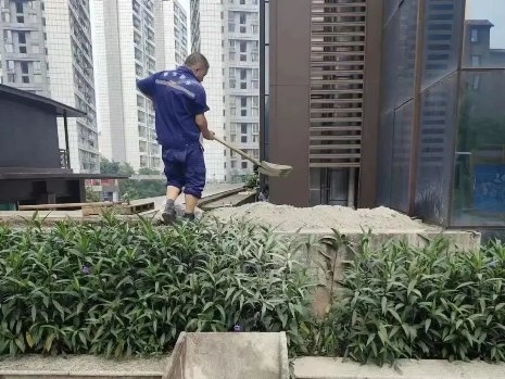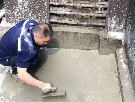因1樓平臺(tái)的空調(diào)外機(jī)位里面要比外面低,不管是空調(diào)機(jī)位的排水或者是下雨天的雨水到了這地方都不能正常排出,一旦積水就會(huì)往樓下滲。馬上雨季來(lái)臨,處理漏水問(wèn)題刻不容緩,黃延與商家協(xié)商整改方案后,立刻和工程馬師傅擼起袖子說(shuō)干就干。黃延與馬師傅首先把平臺(tái)的衛(wèi)生清掃干凈,令臺(tái)面整潔便于施工,馬師傅則用水泥把空調(diào)機(jī)位做高,恢復(fù)整體排水的正常。