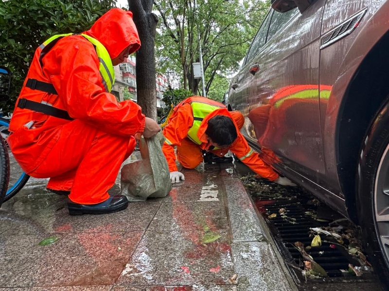 圖為7月31日,邵松松與同事清掏雨水篦子。新華社記者 田晨旭 攝