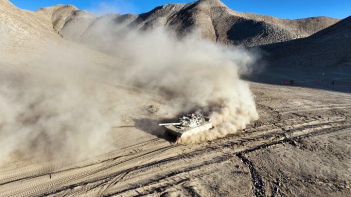 在海拔4000米的野外訓練場,西藏軍區(qū)某旅坦克分隊展開復雜山地路段駕駛機動考核(2023年1月3日攝)。新華社發(fā)(曹智 攝)