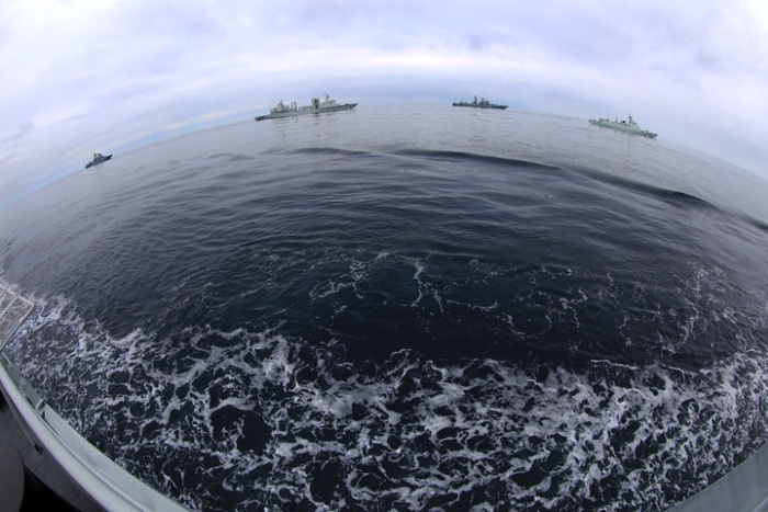 在日本海某海域進行的“北部·聯(lián)合-2023”演習中,中俄雙方艦艇編隊航行(2023年7月20日攝)。新華社發(fā)(張海龍 攝)