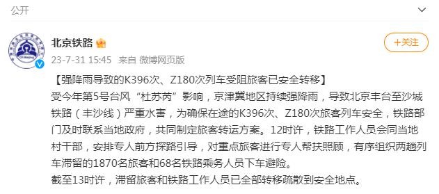 中新網(wǎng)7月31日電 據(jù)中國鐵路北京局集團有限公司官方微博31日消息,受今年第5號臺風“杜蘇芮”影響,京津冀地區(qū)持續(xù)強降雨,導致北京豐臺至沙城鐵路(豐沙線)嚴重水害,為確保在途的K396次、Z180次旅客列車安全,鐵路部門及時聯(lián)系當?shù)卣?,共同制定旅客轉(zhuǎn)運方案。12時許,鐵路工作人員會同當?shù)卮甯刹浚才艑H饲胺教铰芬龑?,對重點旅客進行專人幫扶照顧,有序組織兩趟列車滯留的1870名旅客和68名鐵路乘務人員下車避險。