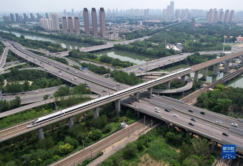 京津城際列車(chē)從天津城區(qū)穿行(7月20日攝,無(wú)人機(jī)照片)。