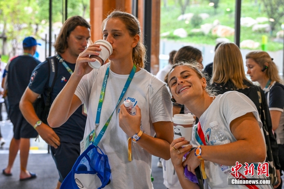 8月1日,參加第31屆世界大學(xué)生夏季運(yùn)動(dòng)會(huì)的大學(xué)生運(yùn)動(dòng)員們參觀成都大熊貓繁育研究基地。成都大運(yùn)會(huì)期間,成都大熊貓繁育研究基地成為參賽代表團(tuán)的熱門打卡點(diǎn)。圖為來自意大利的運(yùn)動(dòng)員品嘗“熊貓”咖啡。中新社記者 趙文宇 攝