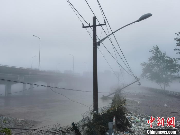 8月1日下午,在永定河京原漫水橋現(xiàn)場(chǎng),武警北京總隊(duì)機(jī)動(dòng)第三支隊(duì)200名官兵正在此處實(shí)施封堵作業(yè),以防止洪水漫溢,影響周邊百姓。圖為京原漫水橋上的一根電線桿已被洪流沖歪,各種雜物散落各處。中新社記者 劉亮 攝