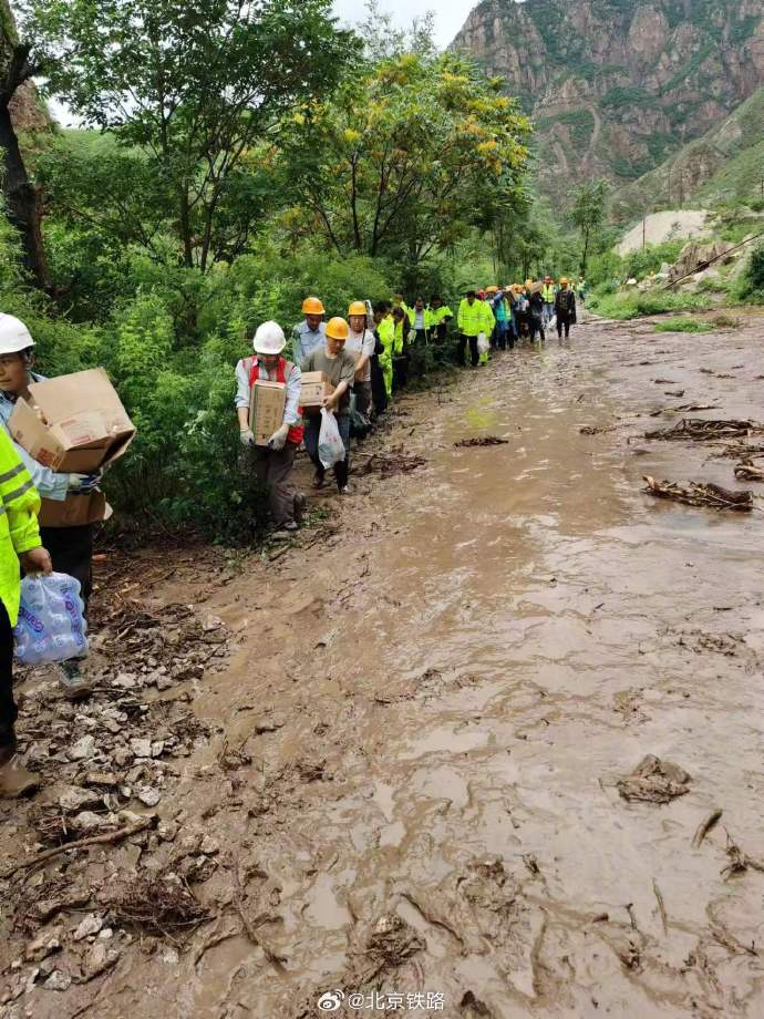 鐵路工作人員為K1178次列車受困人員運(yùn)送物資。(中國鐵路北京局供圖)