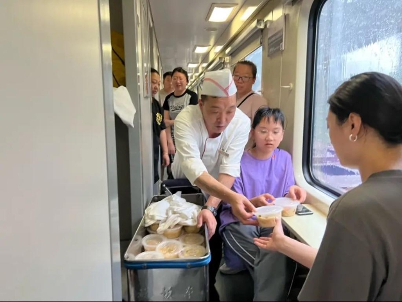 Z180次列車工作人員為旅客發(fā)放餐食。(國鐵集團(tuán)供圖)