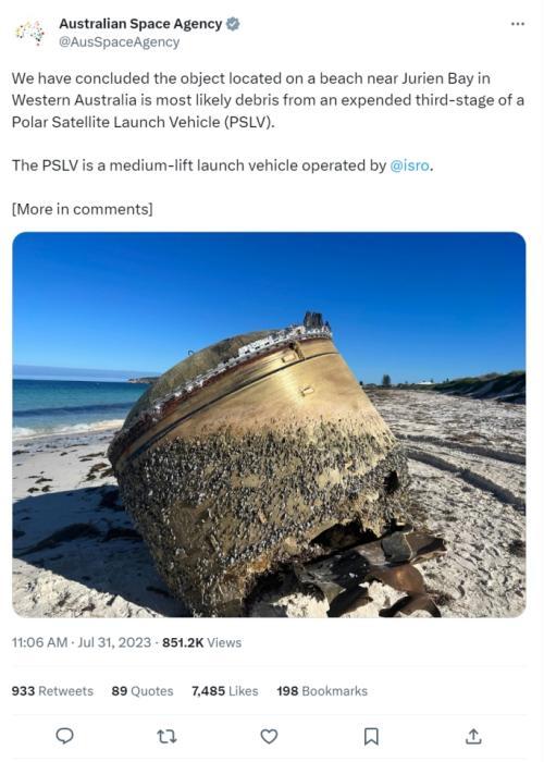 俄羅斯衛(wèi)星通訊社報(bào)道稱(chēng),澳大利亞航天局7月31日在社交媒體上表示,經(jīng)過(guò)調(diào)查,認(rèn)為該物體“很可能是極地衛(wèi)星運(yùn)載火箭(PSLV)第三級(jí)消耗后的碎片”。
