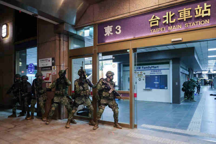 “漢光演習(xí)”模擬臺(tái)北車站遭恐怖分子襲擊。 圖片來(lái)源:臺(tái)灣“中時(shí)新聞網(wǎng)”黃世麒攝