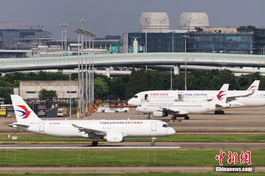 8月2日,東航第二架注冊(cè)號(hào)為B-919C的國產(chǎn)C919大型客機(jī),從上海虹橋機(jī)場(chǎng)起飛。根據(jù)東航的規(guī)劃,第二架C919將與首架機(jī)“搭檔”,投入東航“上海虹橋—成都天府”空中快線。中新社記者 殷立勤 攝